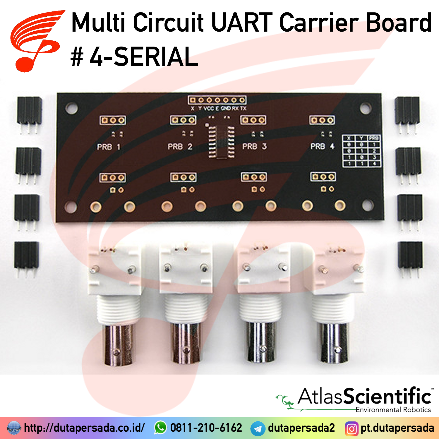 This carrier board multiplexes four Atlas Scientific circuits to give 1 UART output. The seven pins on top are left open for you to decide how to connect it to your system.