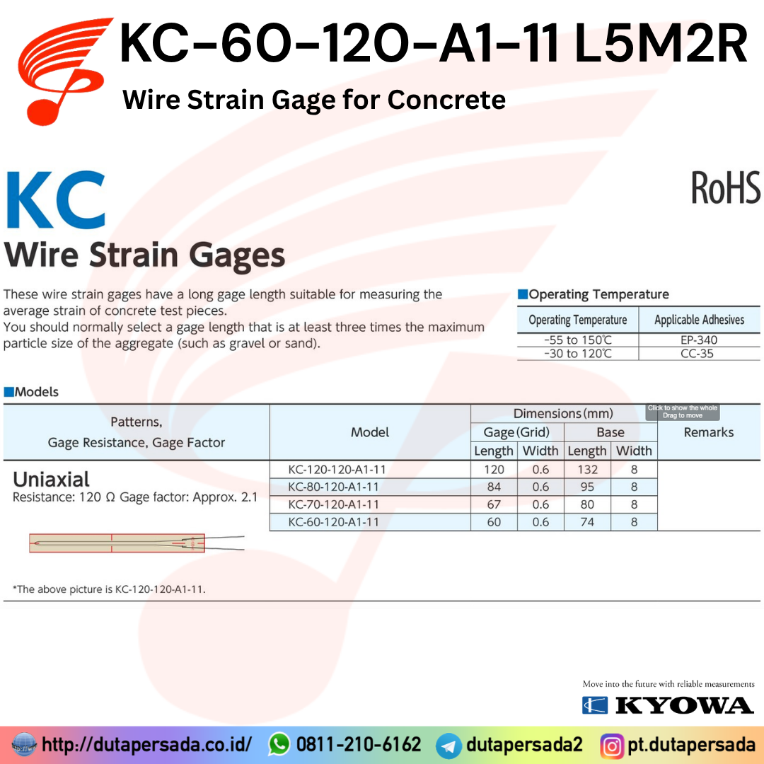 Featuring a longer gage length, the KC series gages are wire strain gages suitable for mean strain measurement of concrete under test. Usually, a model with the gage length over 3 times longer than the maximum diameter of the aggregate is selected for the purpose.