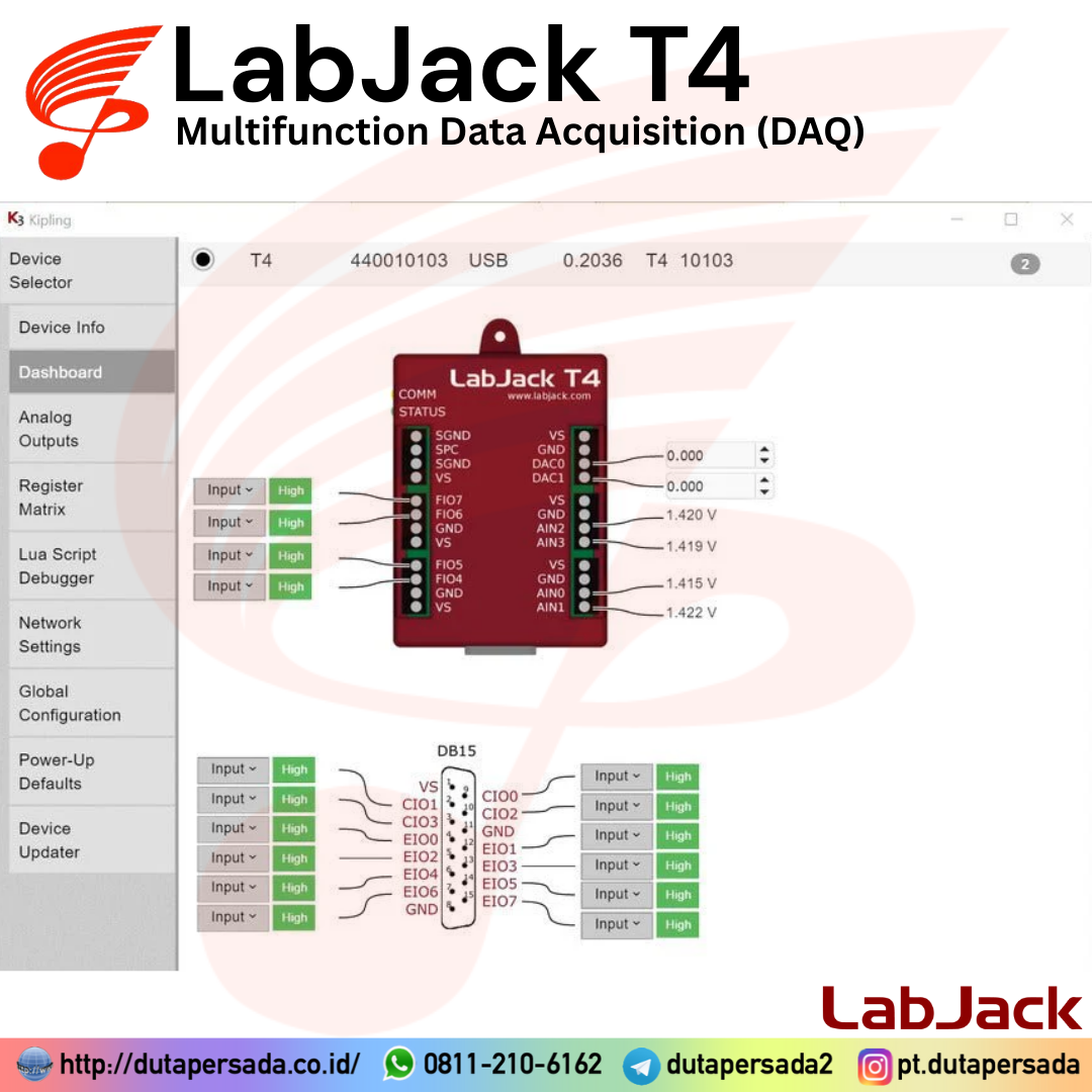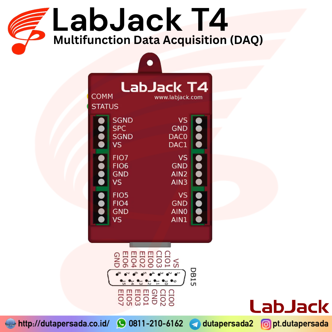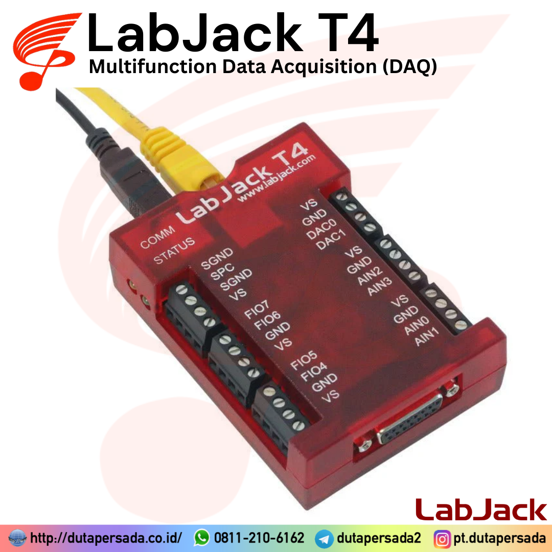 LabJack T4 is USB or Ethernet multifunction DAQ device with up to 12 analog inputs or 16 digital I/O, 2 analog outputs (10-bit), and multiple digital counters/timers.